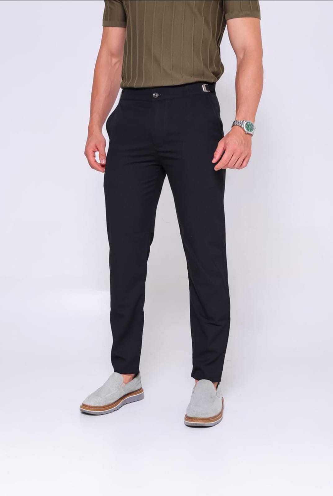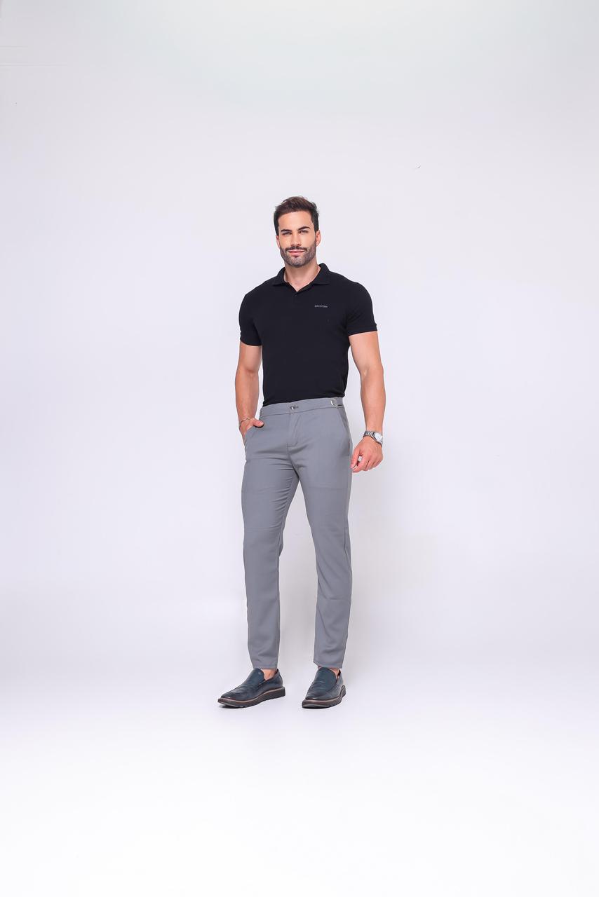 - Modelagem: Slim Fit com ajuste lateral