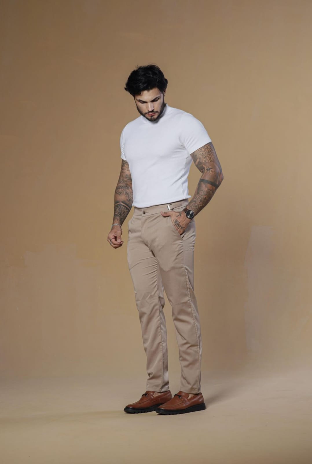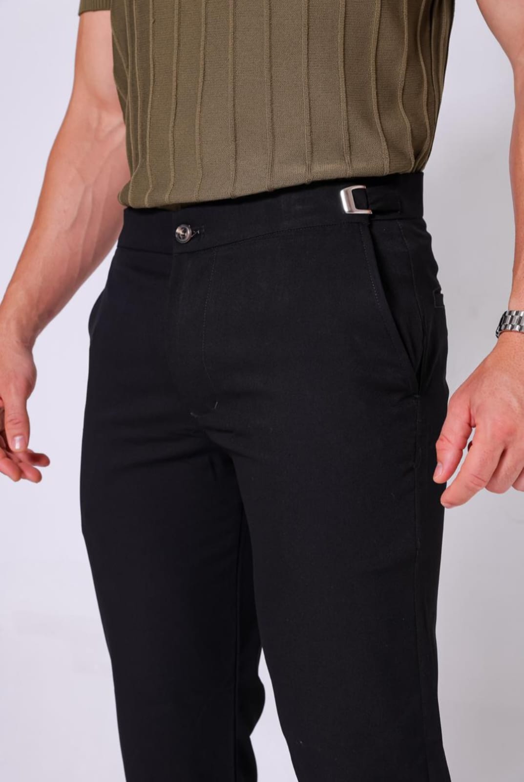 - Modelagem: Slim Fit com ajuste lateral